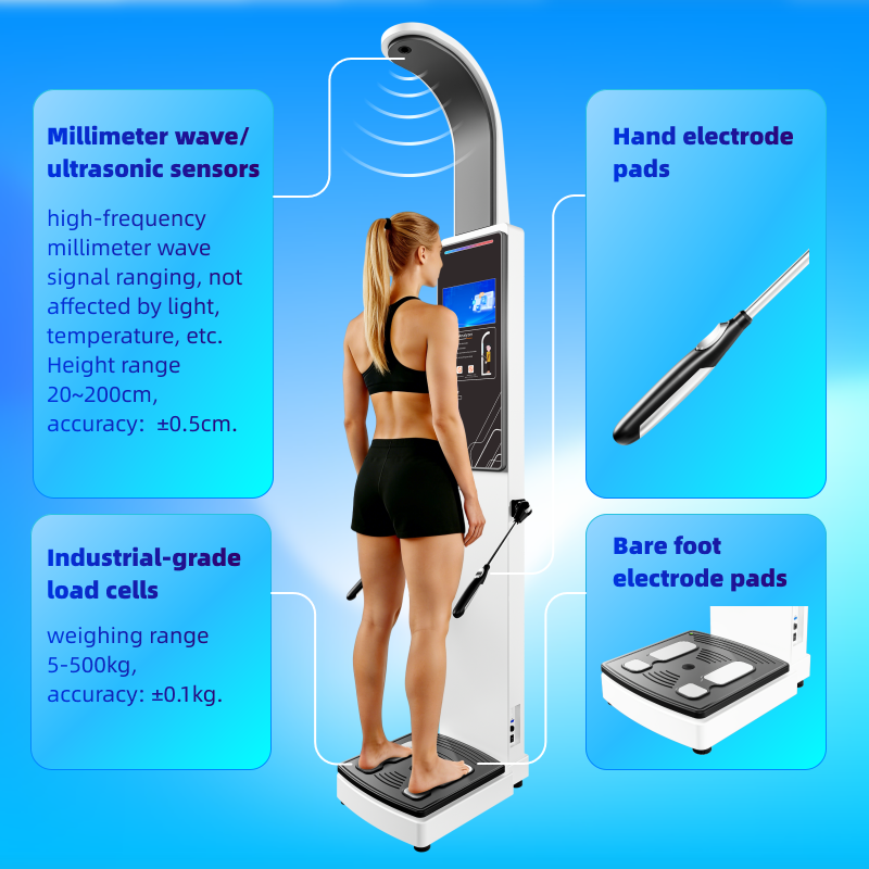 1.주요 기능은 키, 몸무게, BMI, 체성분 분석, 열전사 프린터, 얼굴 인식(선택 사항)입니다.